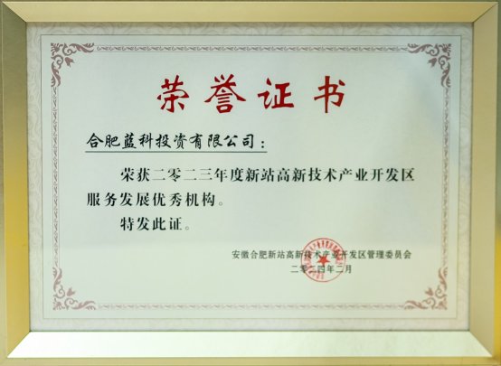 2月25日,合肥新站高新區(qū)管委會(huì)召開了2023年優(yōu)秀企業(yè)表彰大會(huì),合肥藍(lán)科投資有限公司榮獲2023年度新站“服務(wù)發(fā)展優(yōu)秀機(jī)構(gòu)”稱號(hào)。